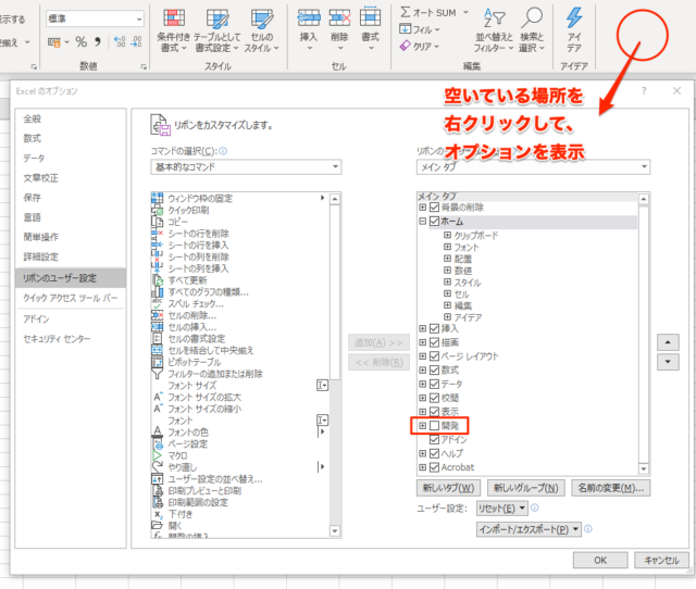 リボンのどこでもいいので、マウスの右クリックでメニューを開き「リボンのユーザー設定」を選択してください。