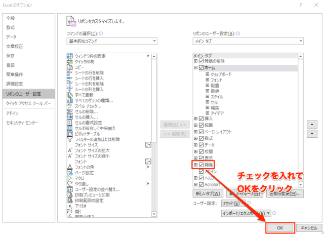 初期状態では、リボンのユーザ設定リストの「開発」にチェックが入っていないので、チェックを入れて「OK」をクリックします。