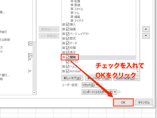 初期状態では、リボンのユーザ設定リストの「開発」にチェックが入っていないので、チェックを入れて「OK」をクリックします。