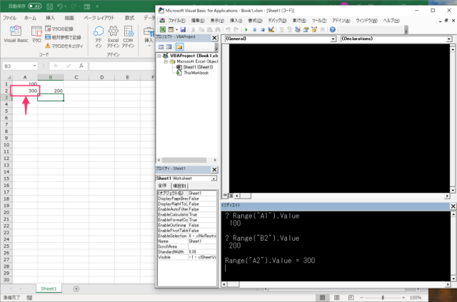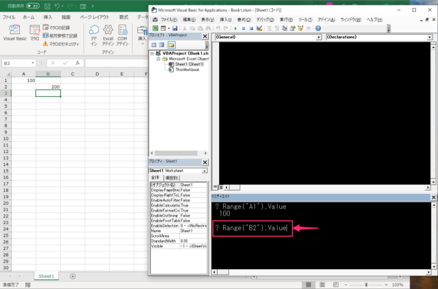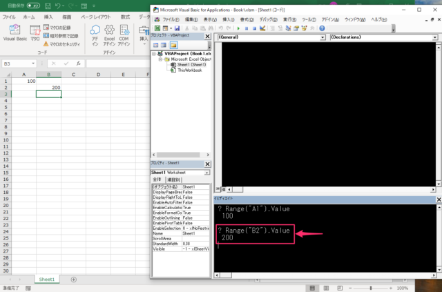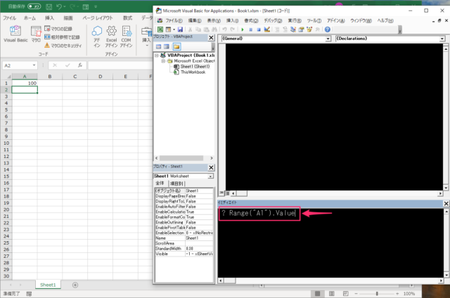 先ほどセルA1に入力した「100」がイミディエイトウィンドウに表示されます。