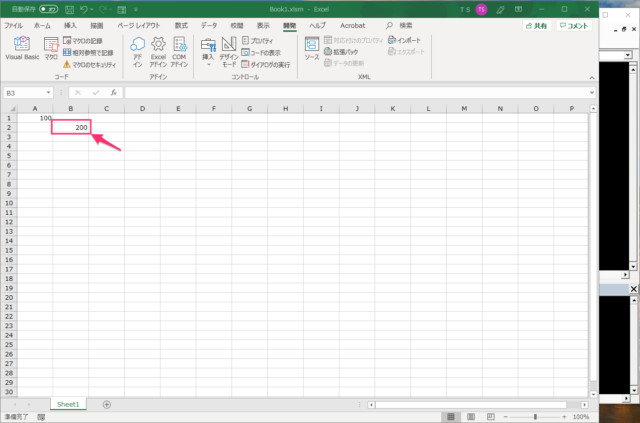 つまり、「A1:C3」で、左上A1、右下C3の範囲を指定して、そこのセル全部に200を入力するという意味になります。