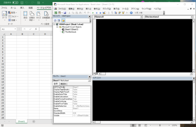 VBEの画面(VBAの開発環境 ※基礎2−1参照)を開いたら、操作結果が見やすいように、ブックとVBEの画面を次のように左右に重ねて並べてください。