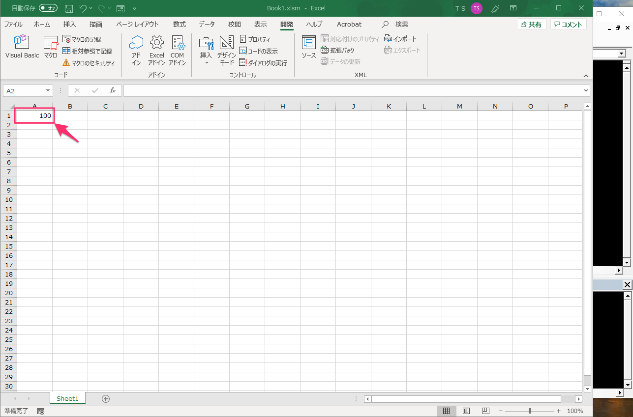 先ほどセルA1に入力した「100」がイミディエイトウィンドウに表示されます。