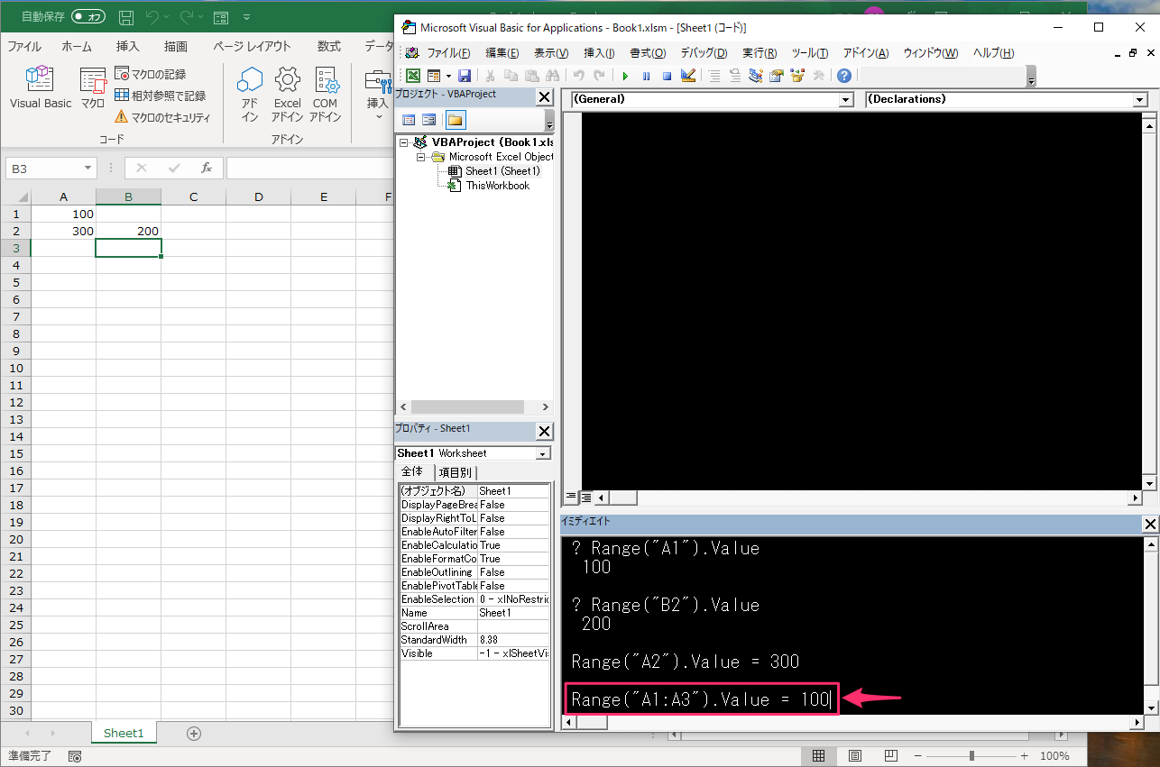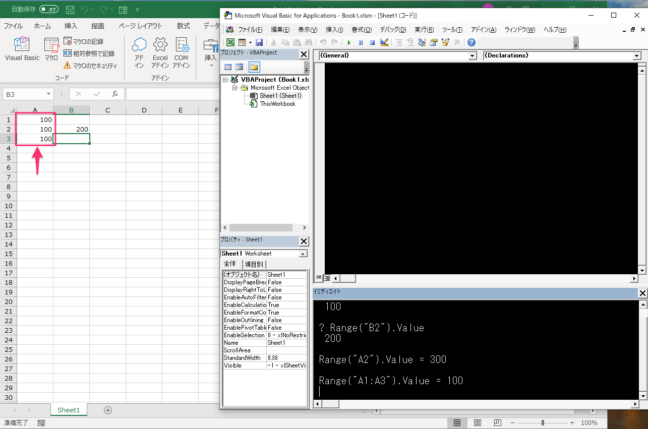 つまり、「A1:A3」で、A1:A3の範囲を指定して、そこのセル全部に100を入力するという意味になります。