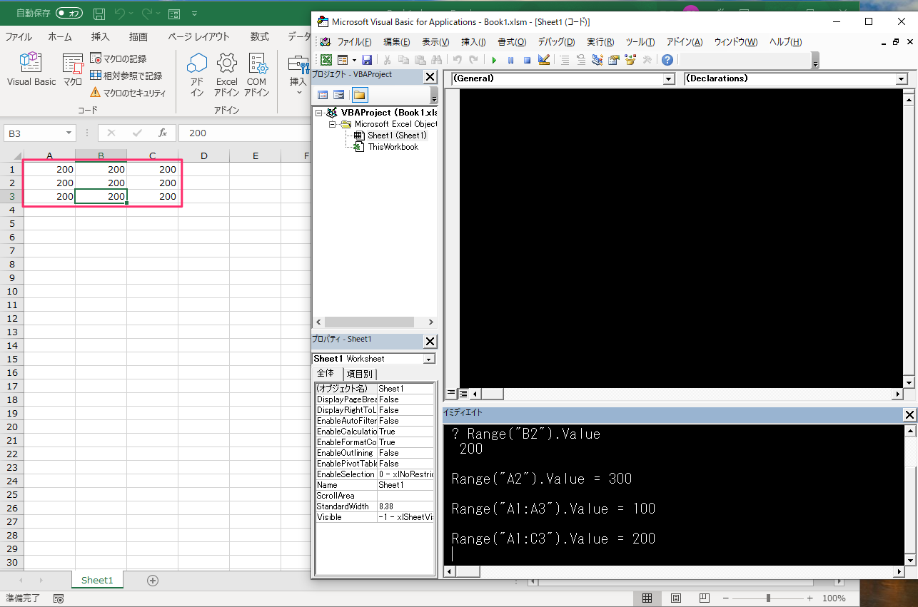 つまり、「A1:C3」で、左上A1、右下C3の範囲を指定して、そこのセル全部に200を入力するという意味になります。