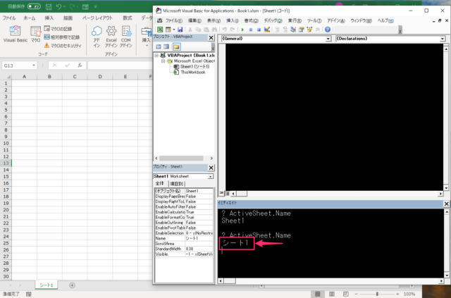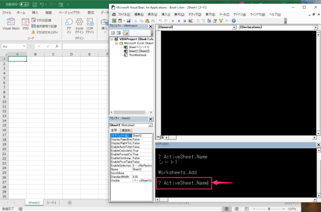 変更したシート名がイミディエイトウィンドウに表示されます。