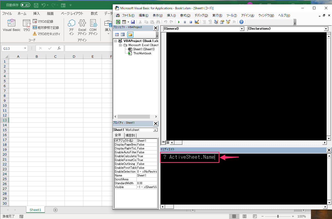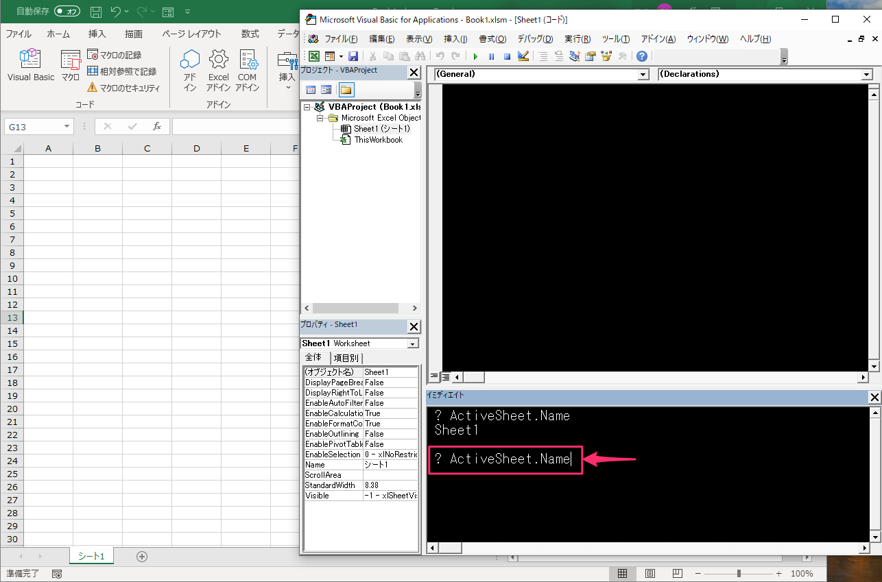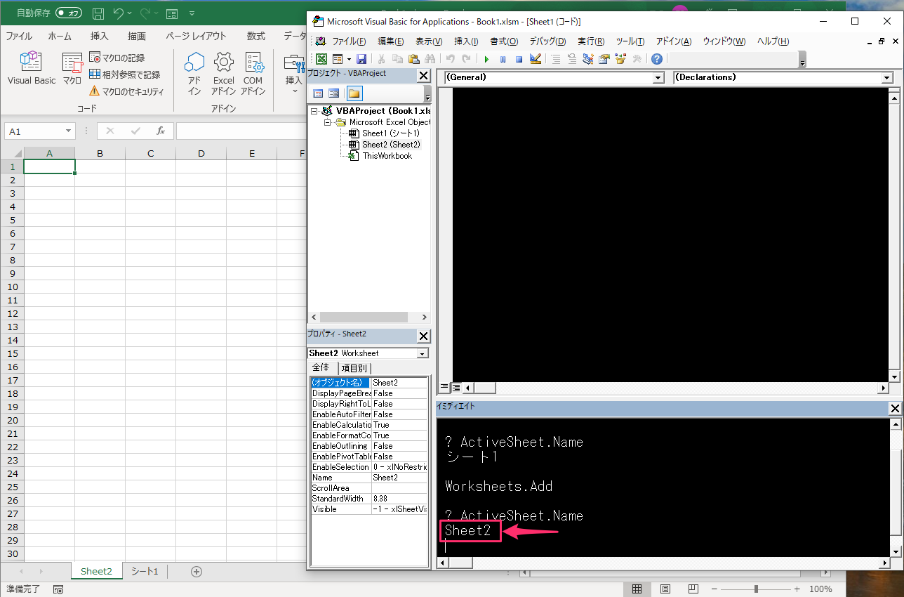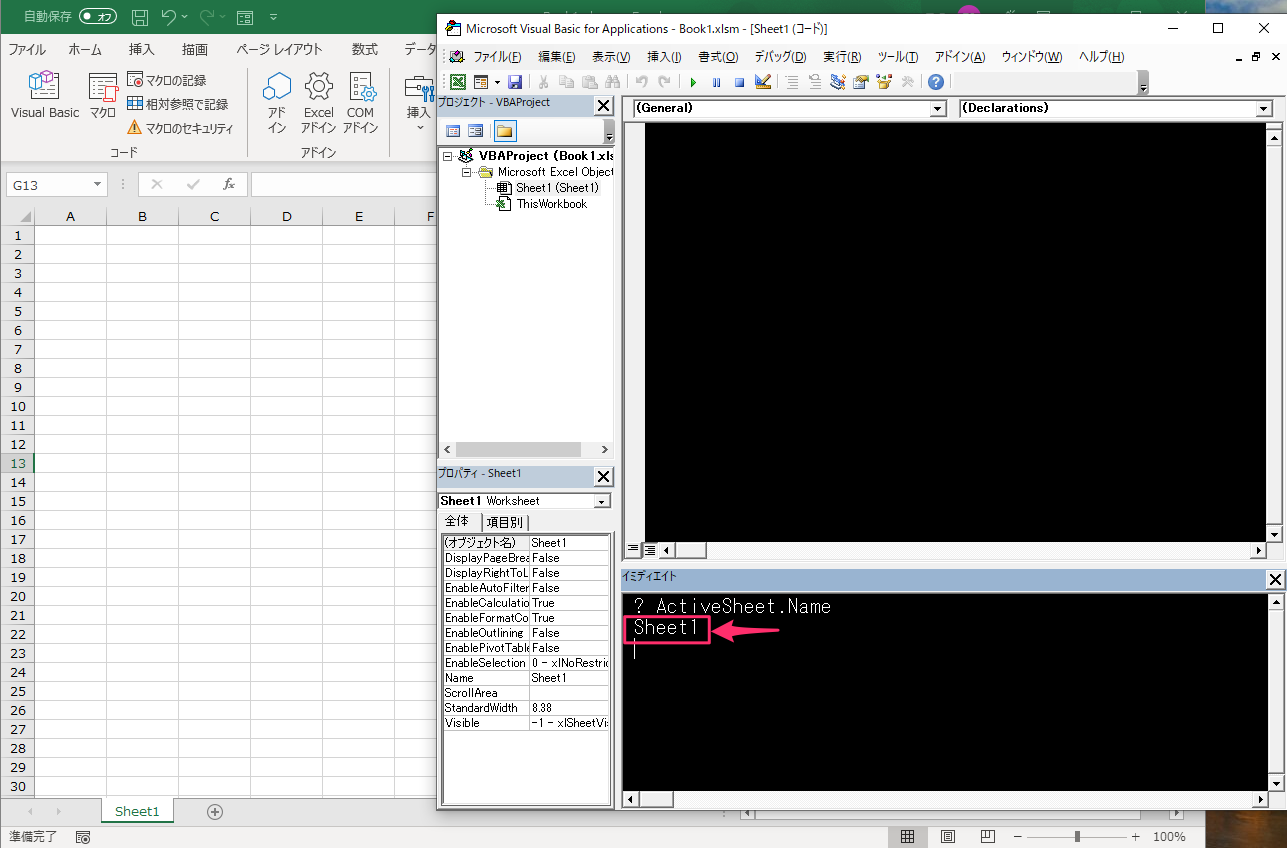 変更したシート名がイミディエイトウィンドウに表示されます。