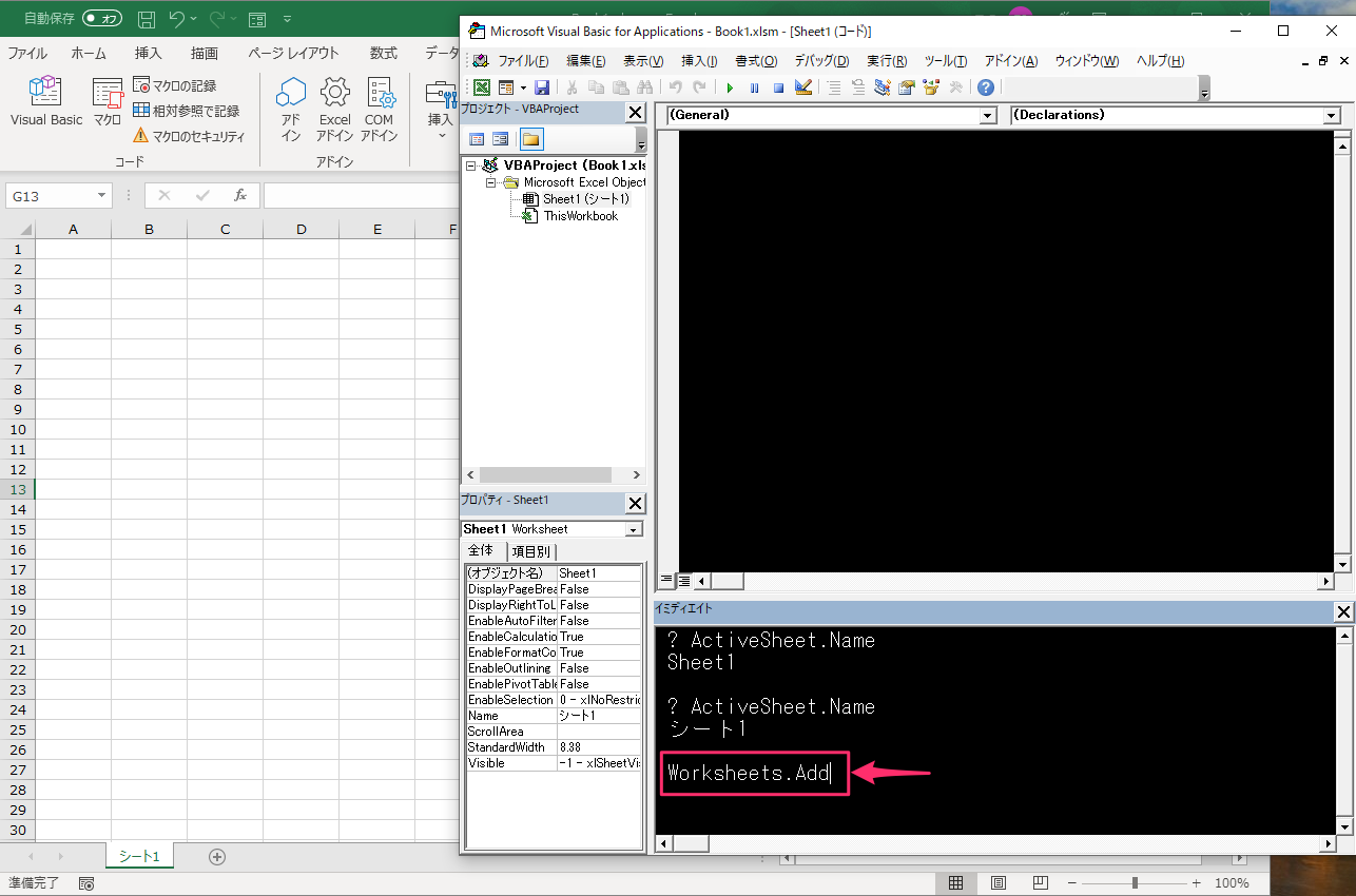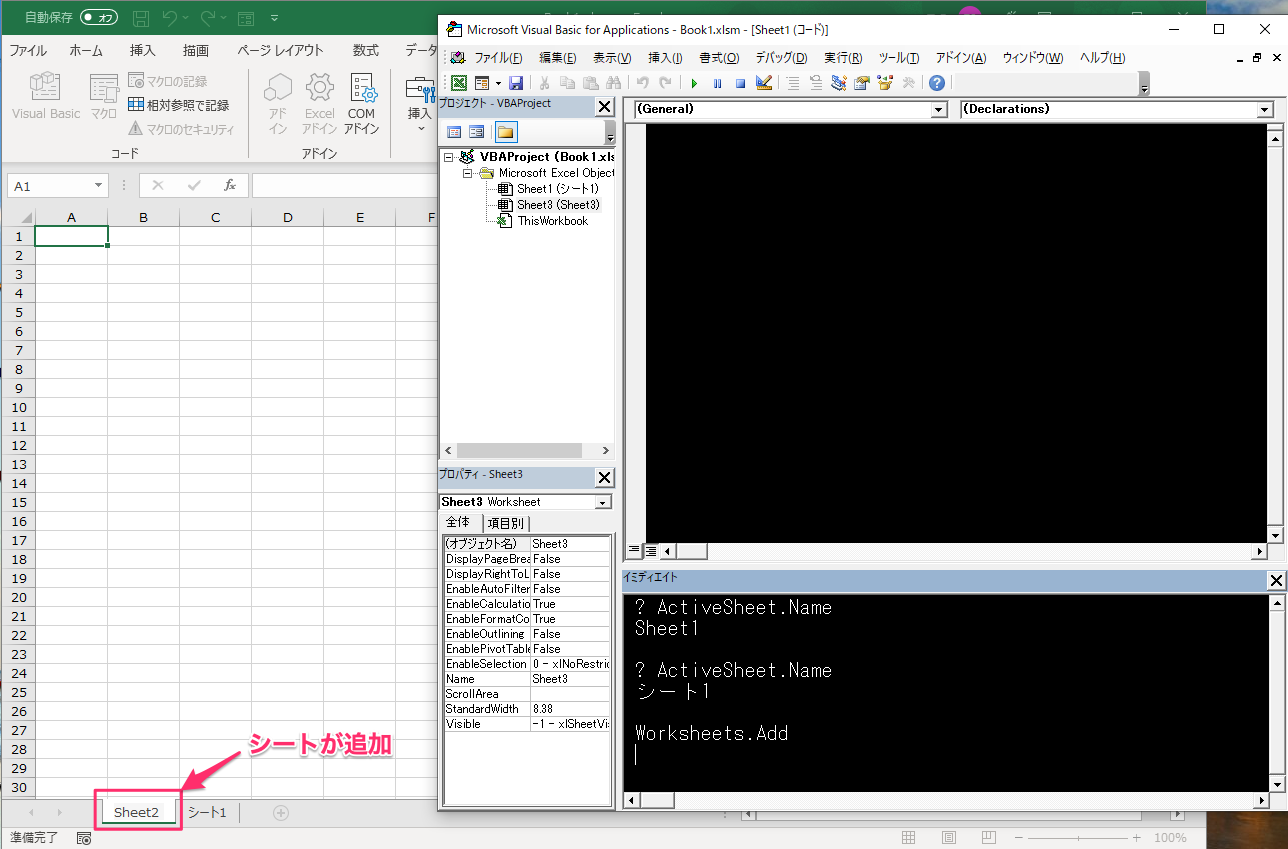 このようにワークシートもイミディエイトウィンドウから自由に操作できます。