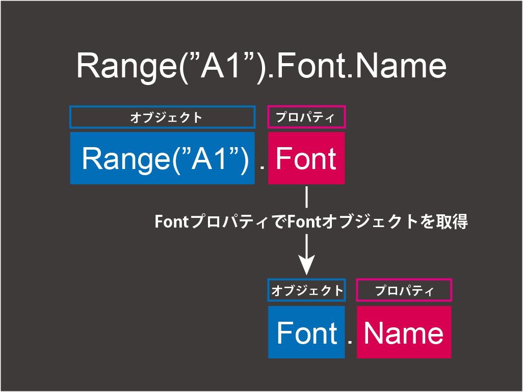 で、Rangeオブジェクト.Fontプロパティという形が評価されて、Fontオブジェクトを取得します