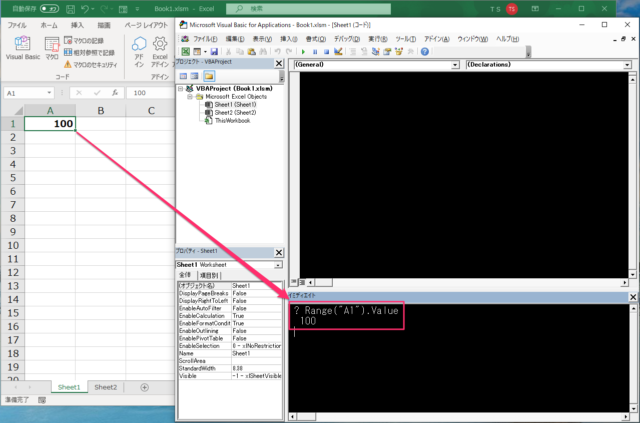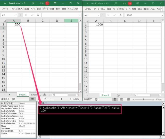 Sheet2が選択されている状態でも、この書き方をすればSheet1のセルを操作することができます。