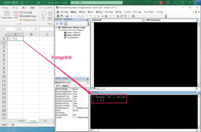 今は、Sheet2がアクティブになっているので、単にRange(“A1”)と書くと、