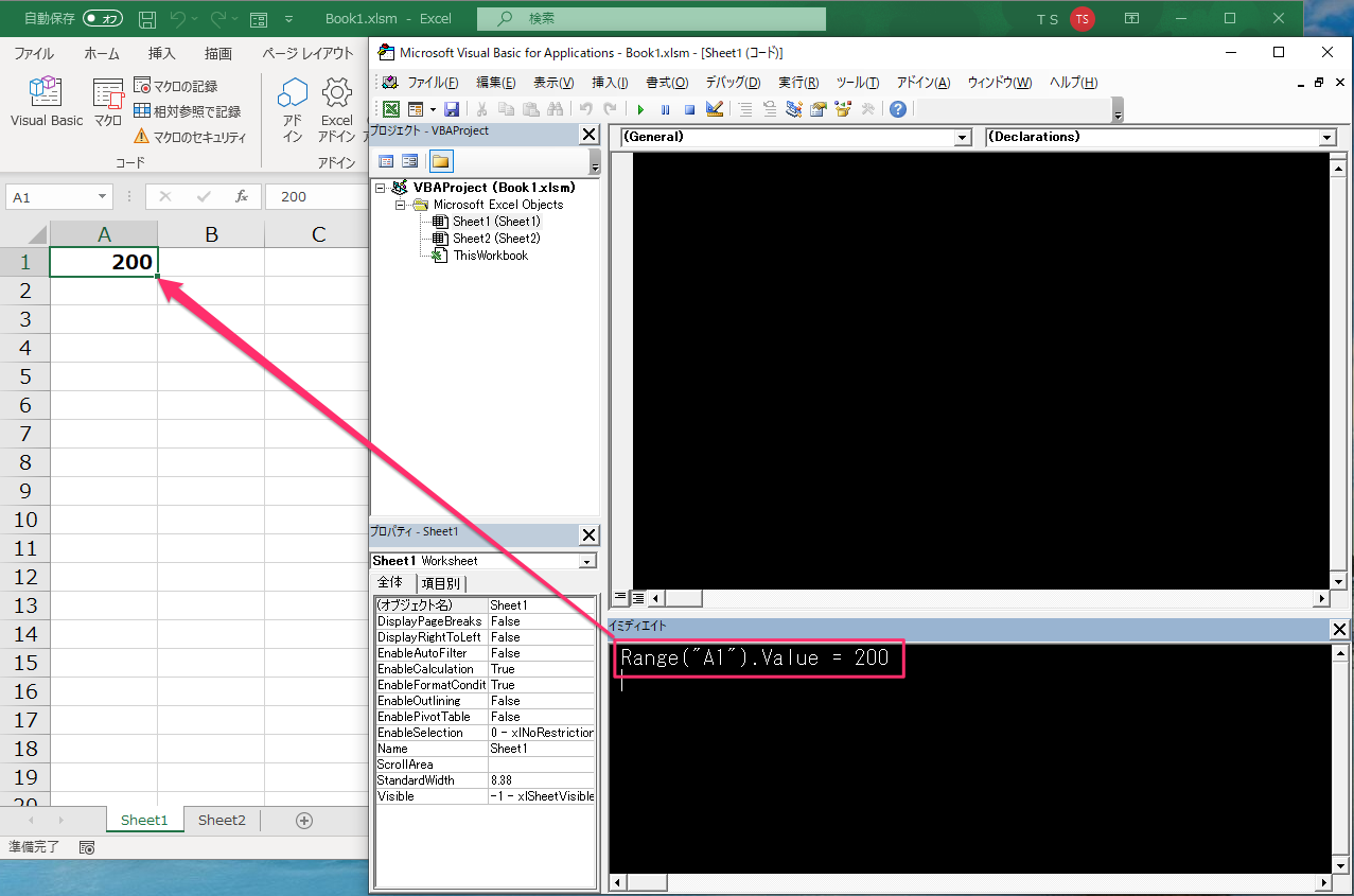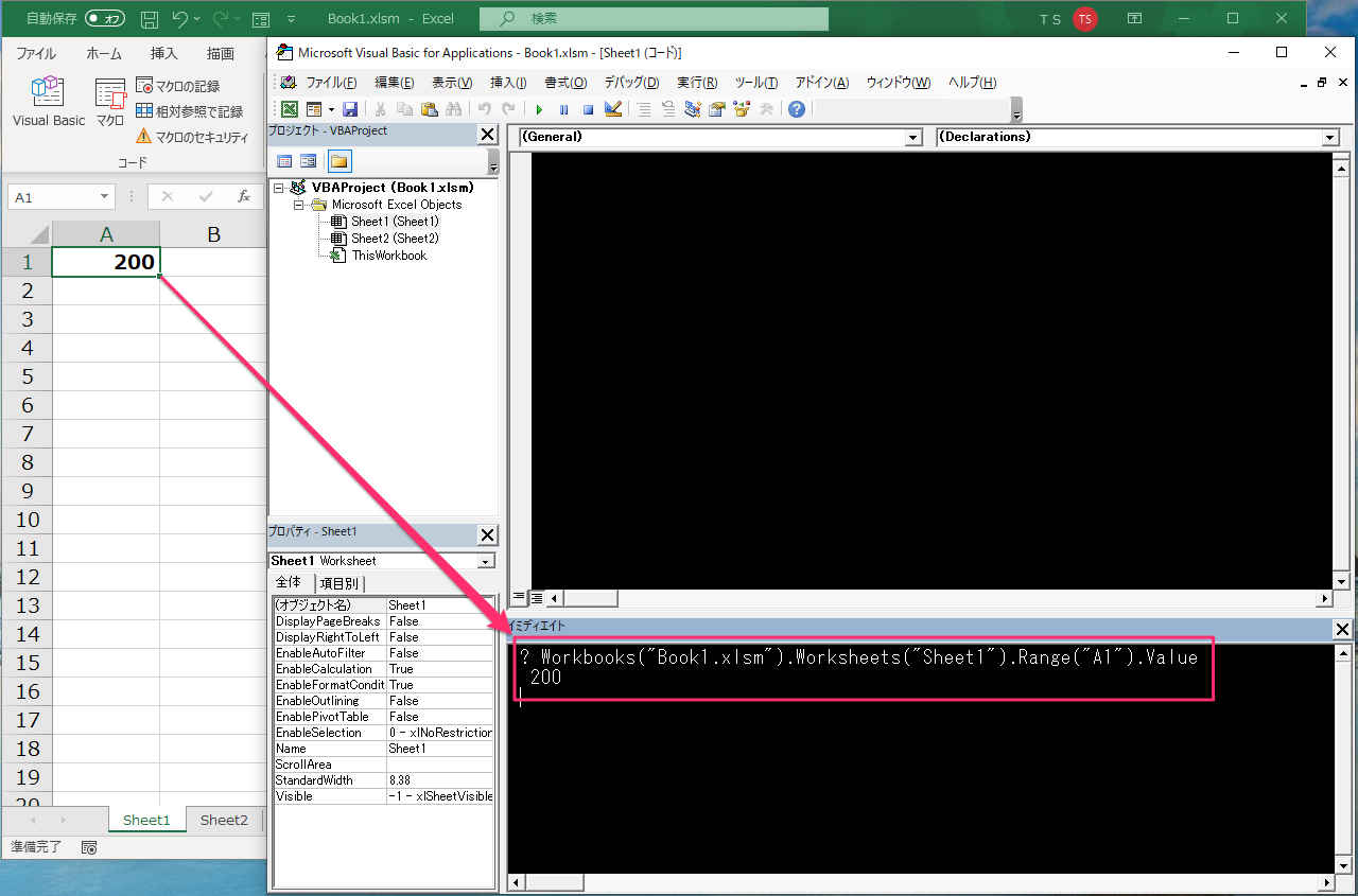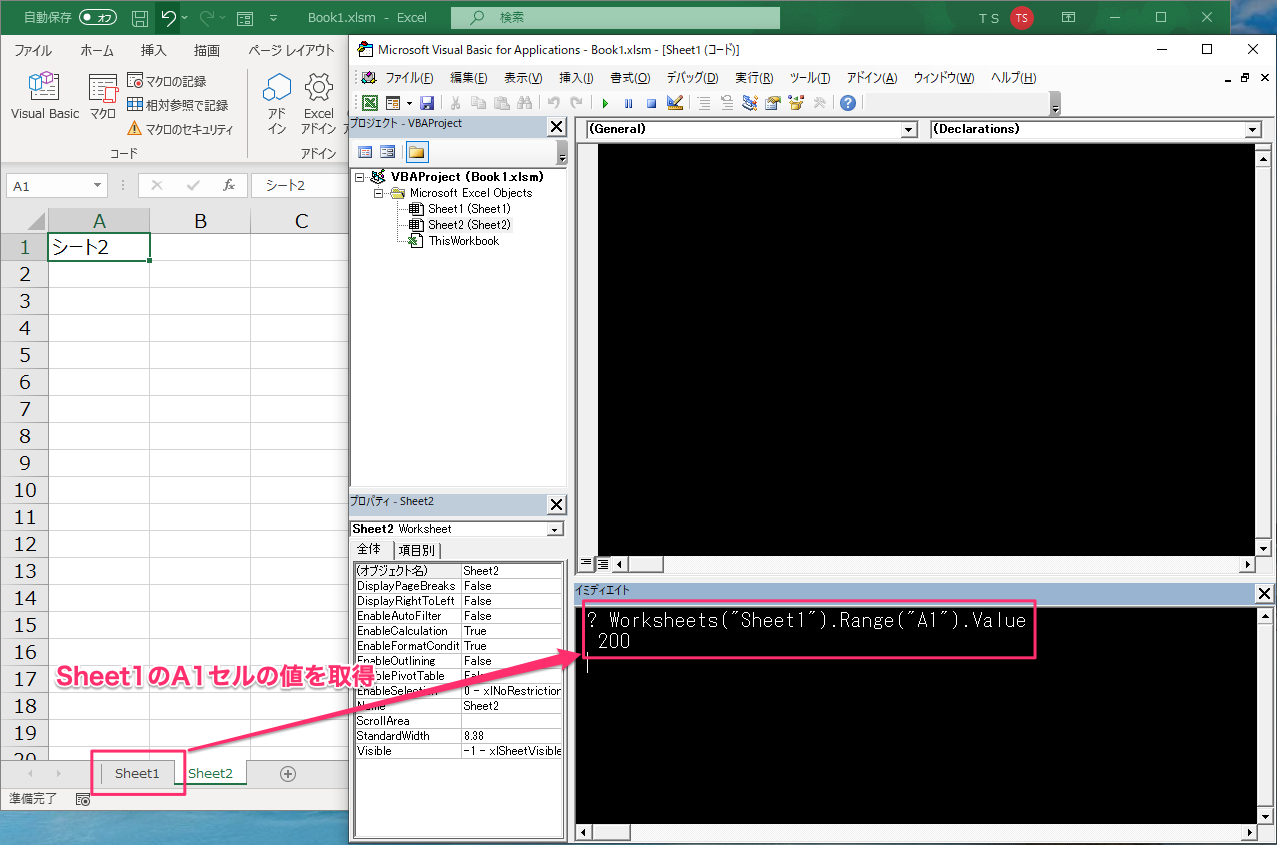 Sheet2が選択されている状態でも、この書き方をすればSheet1のセルを操作することができます。