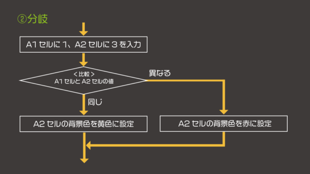 ①<A1セルとA2セルの値が同じなら>A2セルの背景色を黄色に設定