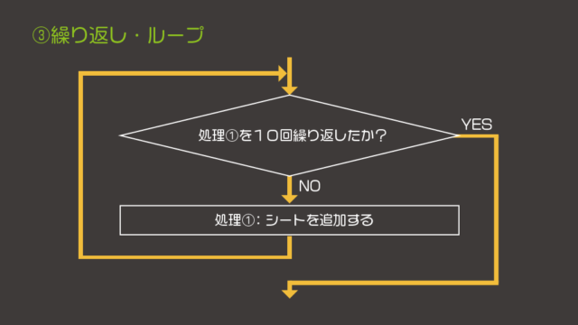 最後にループ(繰り返し)というのは、同じ処理を繰り返し実行するということです。